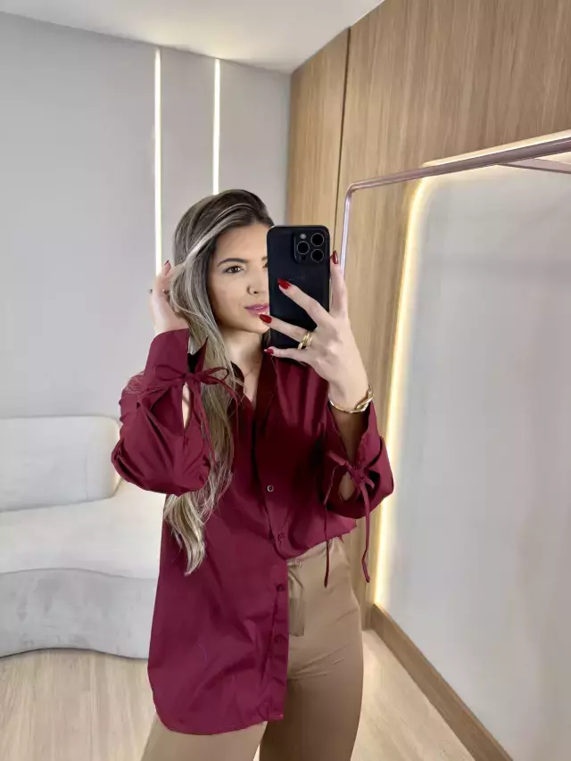 A camisa amarração é uma peça básica nada básica. Confeccionada no tecido duna, possui comprimento alongado, mangas longas, contém fechamento por botões na parte da frente, gola modelo colarinho e seu diferencial é sua costas abertas com amarração.
