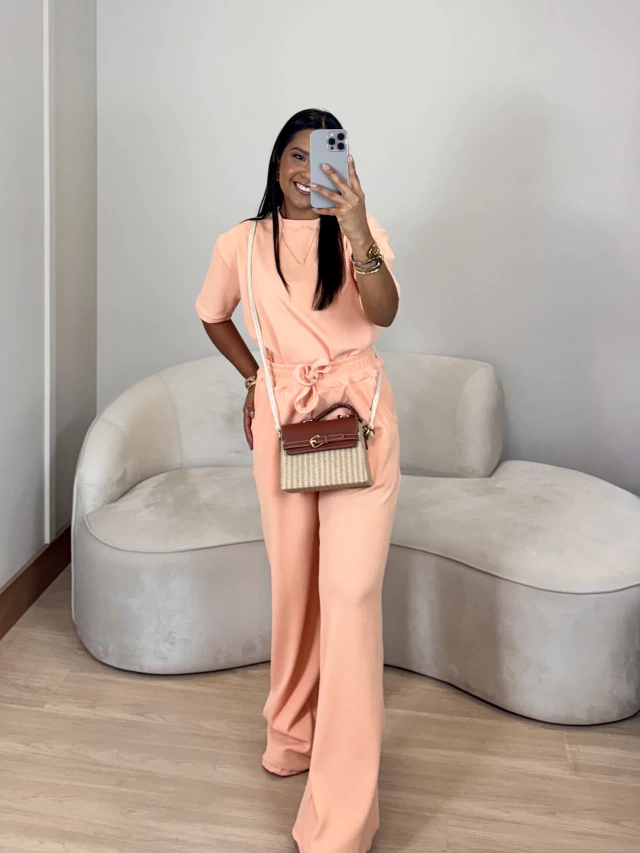 O Conjunto Mel é uma opção prática e estilosa para quem busca um look completo, oferecendo conforto, estilo e versatilidade, aonde você garante duas peças que podem ser usadas juntas ou separadamente podendo compor vários looks. Composto por uma blusa e uma calça, possui tecido estruturado e elegante. A blusa possui modelagem de tamanho normal com manguinha, aquela básica que todo mundo ama. A calça possui modelagem pantalona, ambas as peças são no tecido canelado.