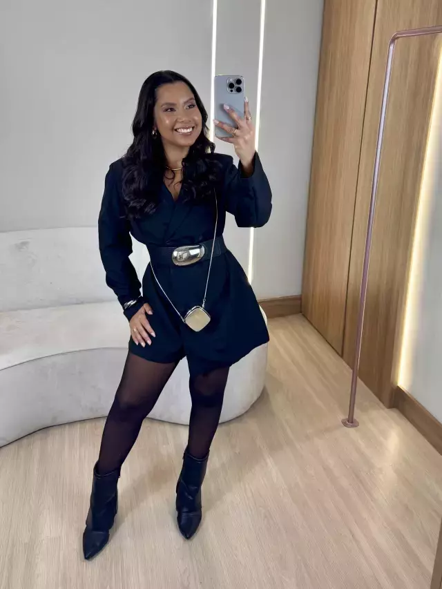 Modo de usar: Como o macaquinho já combina a estrutura de um sobretudo na parte superior com a fluidez de um macaquinho na parte inferior, você pode optar por usar apenas uma blusa básica por baixo para um look mais descontraído. Uma camiseta branca ou uma blusa de alças finas são opções simples que complementam bem a peça.